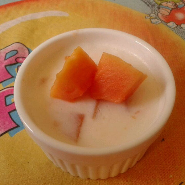 2:椰汁冷却后倒入木瓜,保鲜膜封口后放入冰箱冷藏
