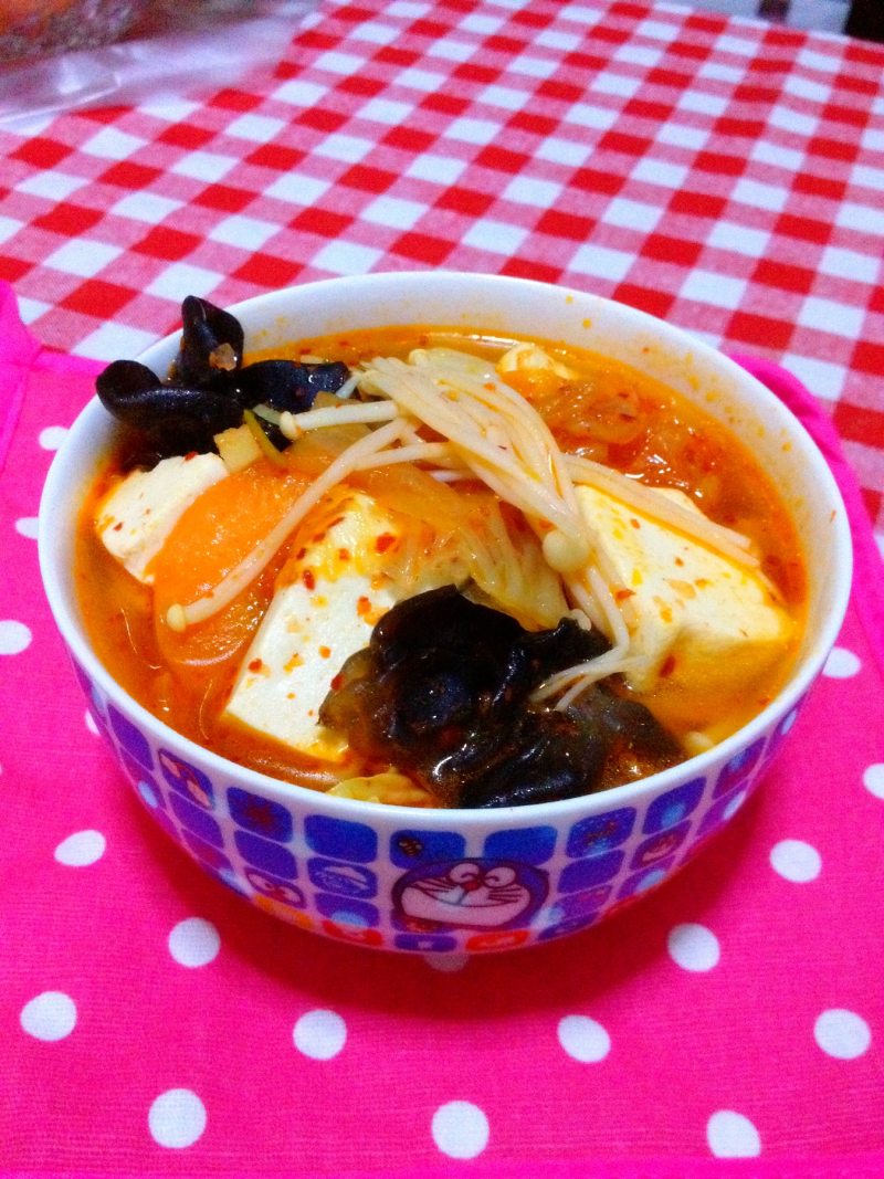 泡菜一段;豆腐一小块;娃娃菜适量;金针菇适量;木耳适量;