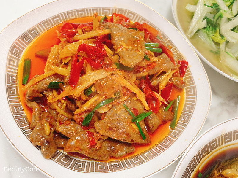 5:炒香调理后倒入焯水过的猪肝炒香加入香油鸡精葱段炒匀即可出锅(不用加盐,泡菜和豆瓣都有盐的分量了)。