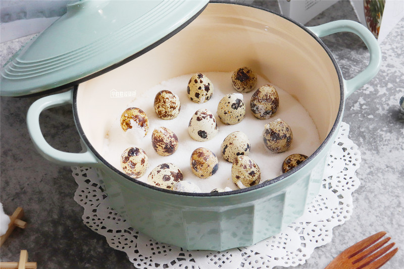 用水煮过的鹌鹑蛋,放热盐中不会遇热即裂。用小火焗,时间不宜太久,十分钟即可。