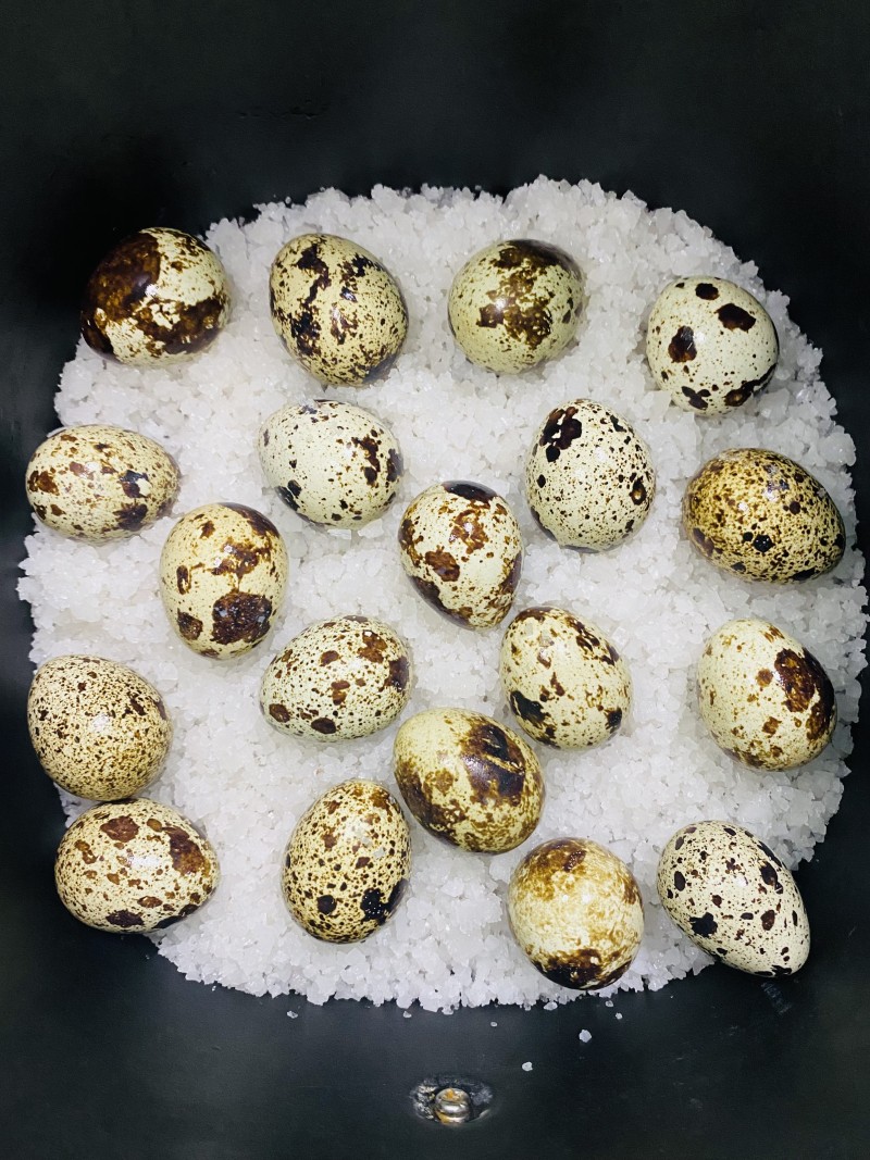 1:将鹌鹑蛋洗净擦干水分,在空气炸锅底部铺上一层盐,再摆上鹌鹑蛋,再铺上一层盐,让盐分充分渗透进鹌鹑蛋。