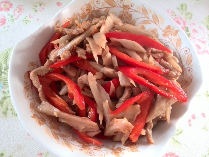 4:放入红椒翻炒,再加盐,生抽,白醋,鸡精适量,迅速翻炒至红椒断生即可