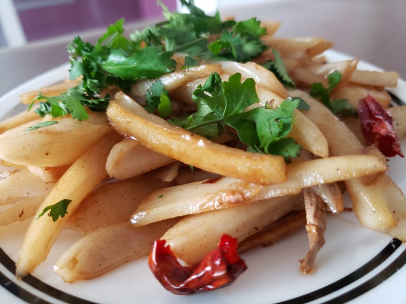 3:锅烧热放少许油,倒入姜和辣椒爆香,再倒入莲藕丝加少许盐和生抽调味,翻炒几下即可。