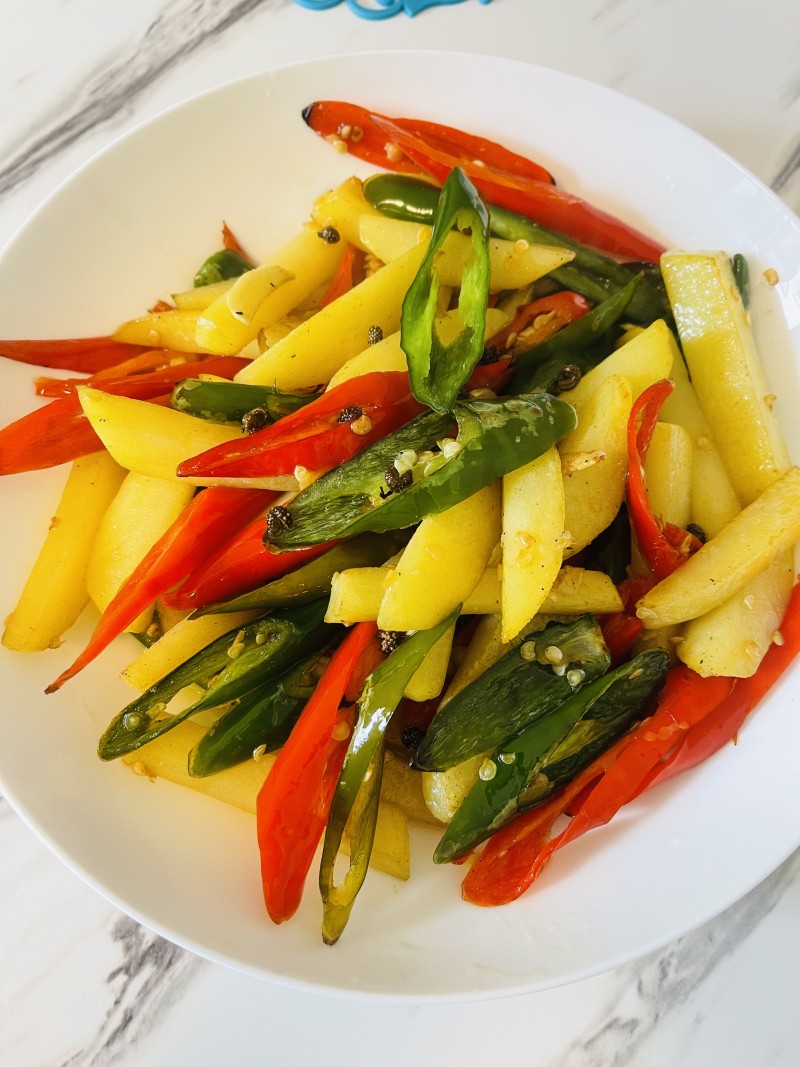 5:在剩余的锅中放入尖椒丝和蒜末,翻炒后倒入土豆条上。