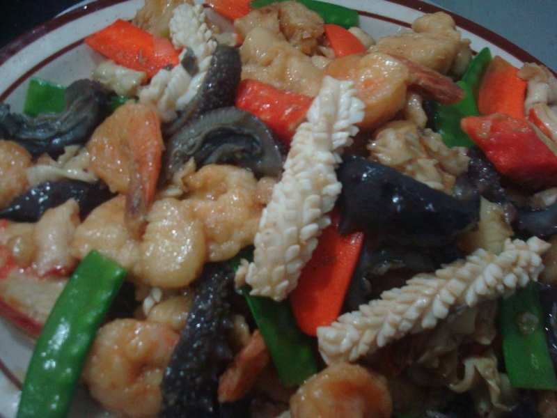 5:铁板加油烧热,倒入鱿鱼煎熟;
