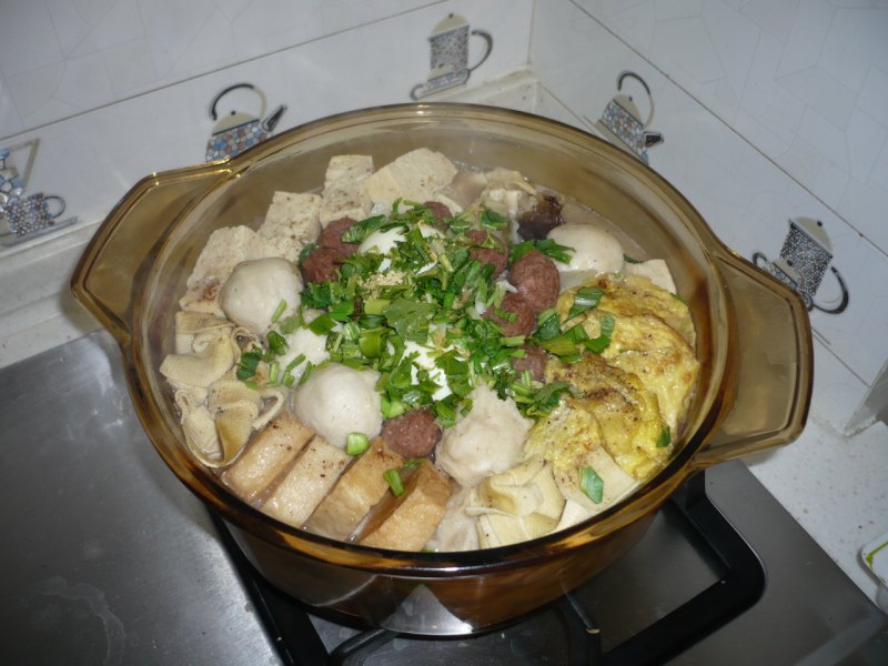 豆腐半块;鱼丸5个;蛋饺5个;冻豆腐半块;白菜3片;牛肉丸10个;千张结5个;