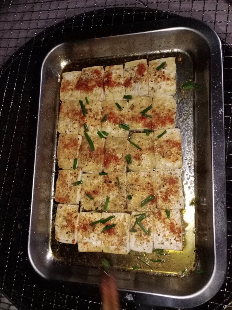 2:碳炉架上铁板,放油,将豆腐放入,煎至两面金黄。