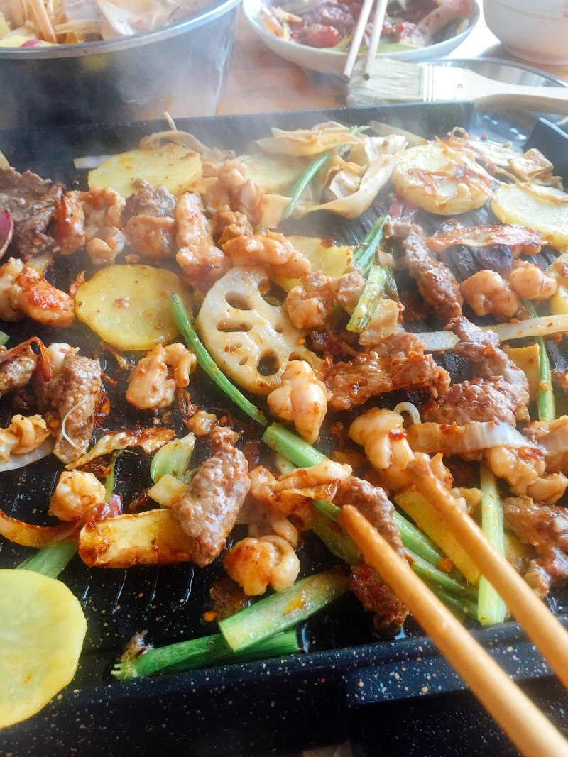 9:铁板上刷少量油,放入各种素菜荤菜慢慢烤熟就可以吃了,喜欢重口味儿的还可以蘸干味碟吃。