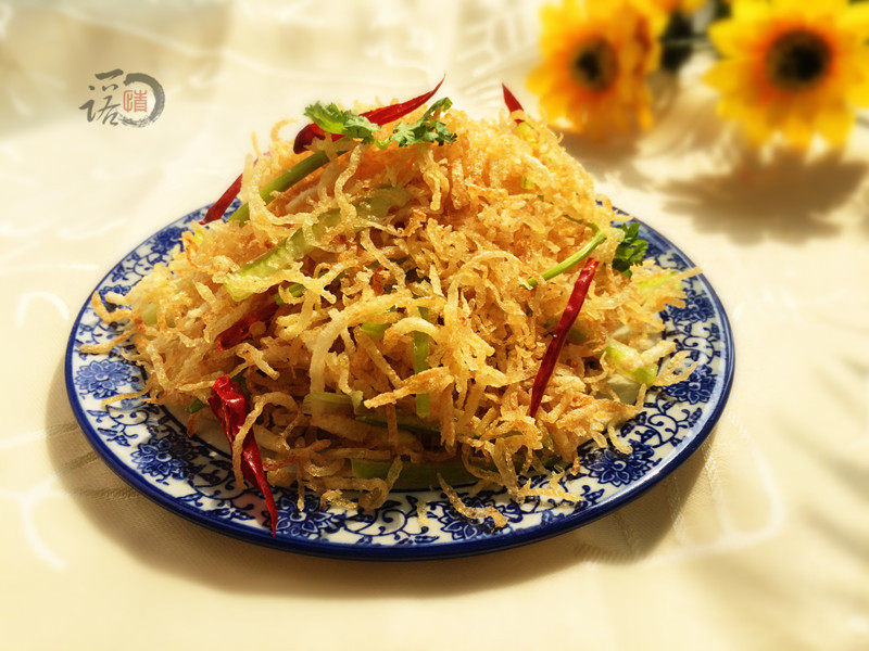 9:趁热撒精盐,将青椒丝、香菜丝、干红椒丝一起搅拌均匀即可