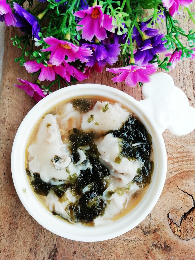 7:水开放入葱花、紫菜、盐、鸡精,熟虾,下入馄饨煮熟,出锅放香油,香菜。