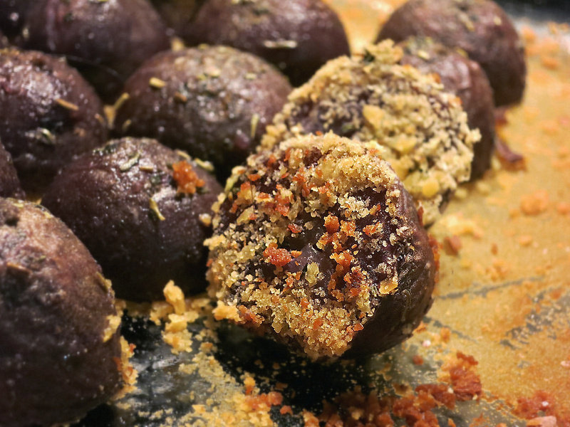 7:把小土豆切面向下的全部铺在烤盘上,用手轻压一下,让土豆粘上饼干碎;