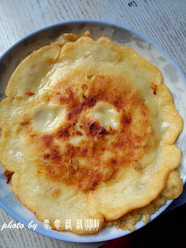 6:盖上锅盖中火烙十几秒钟,底部凝固定型,饼皮中间鼓泡后就可以翻面,另一面继续烙10秒钟左右就可以出锅了。