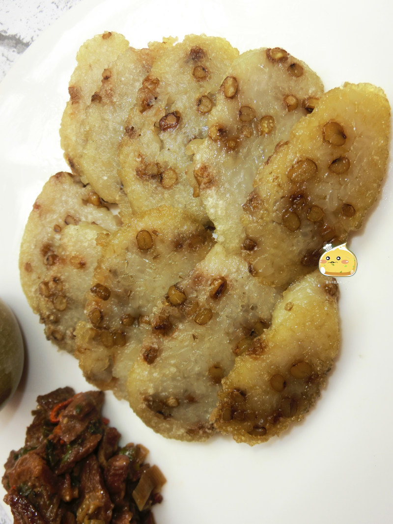 1:冷藏的粽子,直接打开,去了粽叶,切成片,把锅倒少油,煎到两边煎脆。