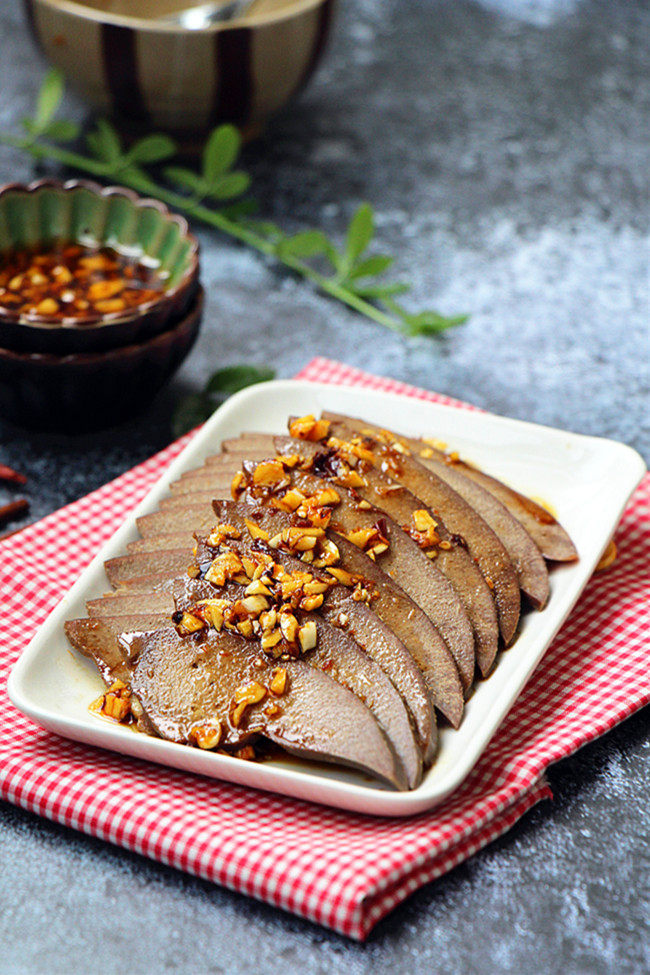 10:吃时切片,用蒜蓉,醋,生抽,香油和少许辣椒油调成料汁,随猪肝一起上桌蘸汁食用。