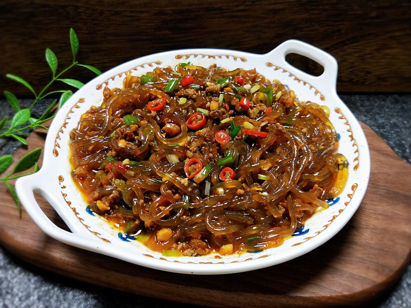 粉条一定要提前泡软,至少要一小时,全程开中火炒制,调入调料开锅后不宜久煮。