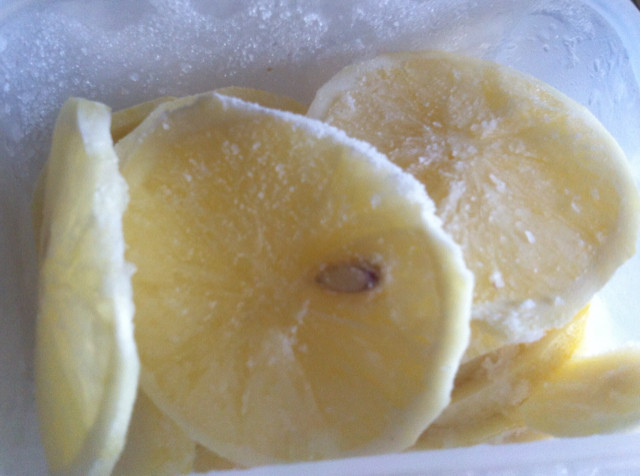 3:取一个杯子将冻好的雪碧块放入杯子里(小杯子一块,大杯子两块),倒入晾凉的白开水就可以开始享受美味又不太凉的柠檬水啦