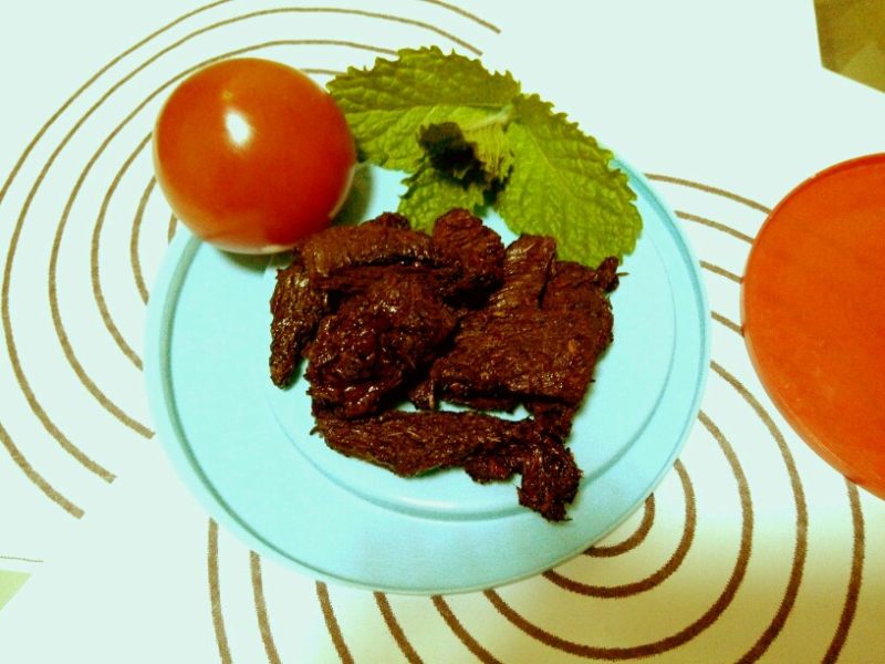 6:将牛肉干取出放入烤盘中,刷一层蜂蜜,180度左右火,烤约15分钟(如果喜欢口感稍微软一点,就可以省去烤制这一环节)