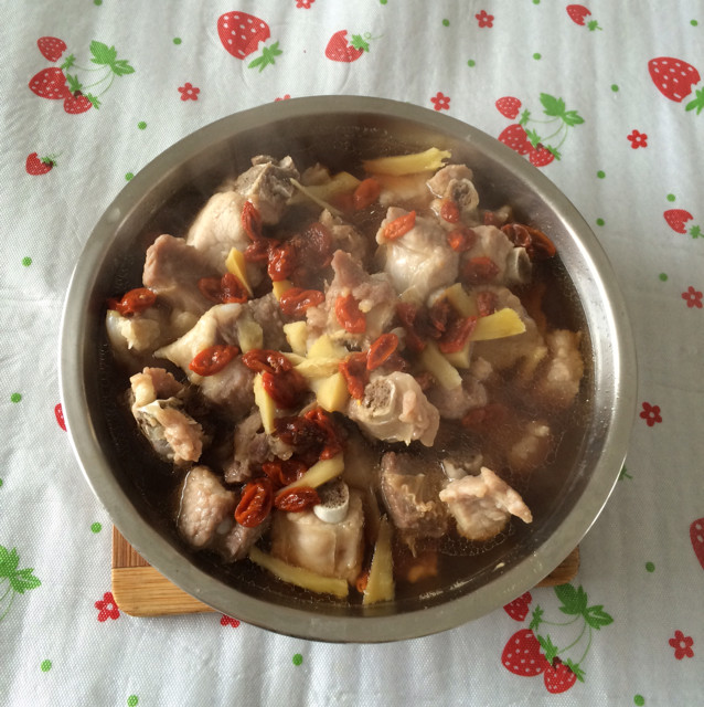 1:排骨洗干净,把所有配料放进去调味,搅拌均匀,然后撒上姜和枸杞