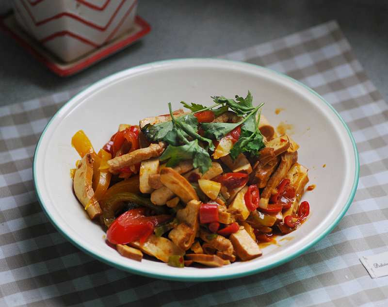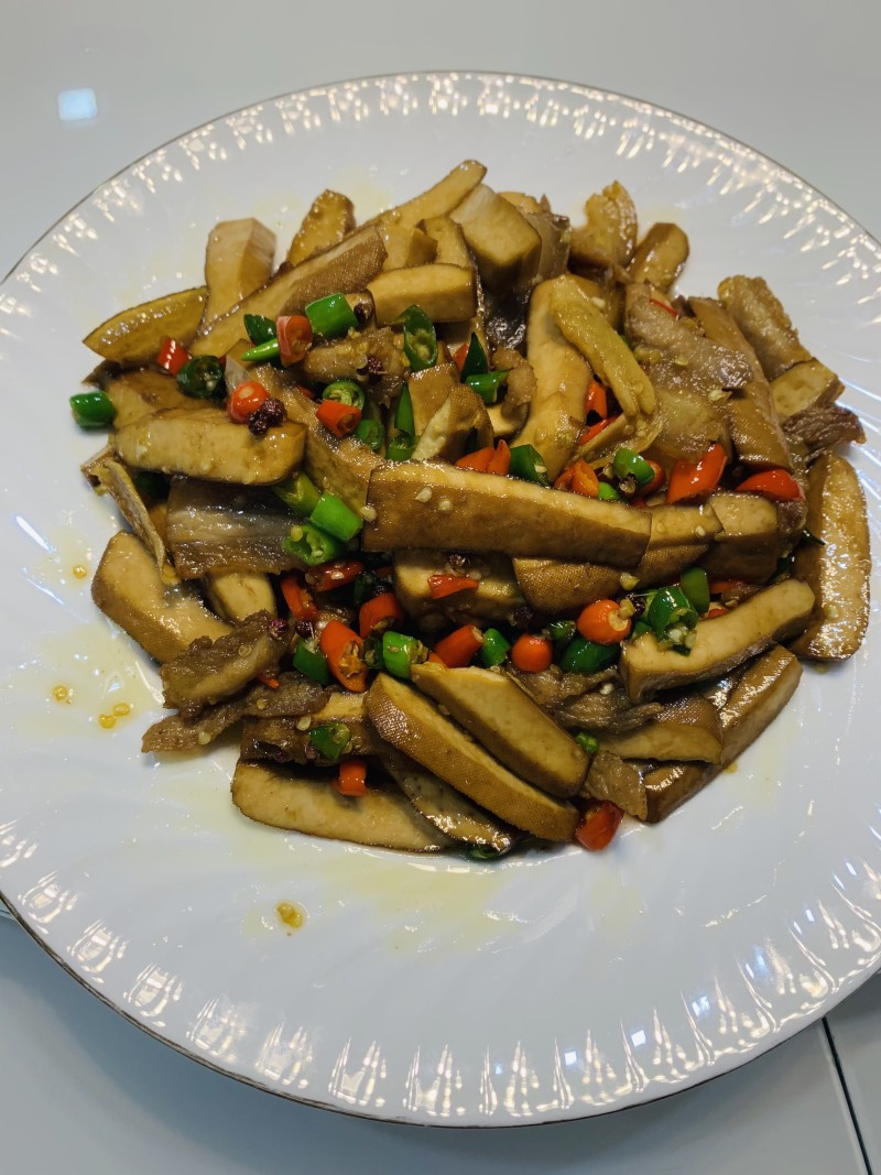 4:炒制瘦肉变色之后,加入香干和青红黄椒翻炒,加入豆瓣酱,炒熟即可出锅。