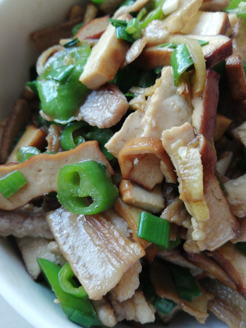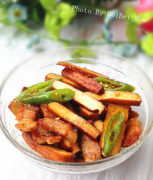 1:五花肉用水煮15分钟捞出切片备用,豆干煮2-3分钟捞出切片备用。