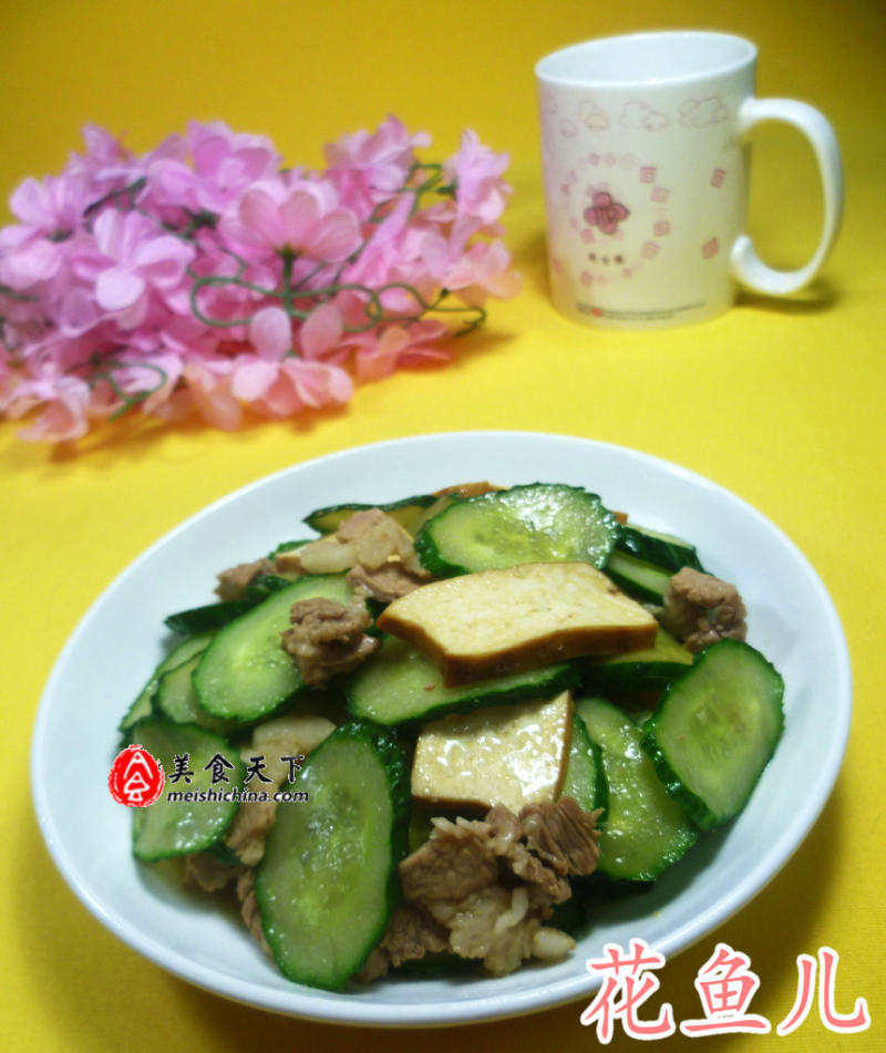 9:然后,合入切好的香干和青瓜翻炒翻炒。