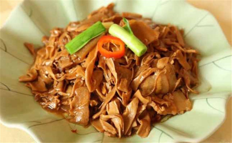 4:倒入笋干一起炒,加入适量水,调料,焖上5分钟左右,最后加入水淀粉收汁即可。