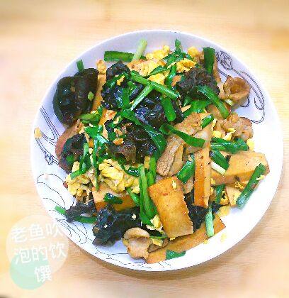 3:不换锅利用炒鸡蛋剩下的底油煸五花肉至灯盏状后加葱姜末爆香,点入料酒,加适量酱油爆出香味后加入香干,待香干熟后加入木耳炒掉水气后,加盐、鸡粉炒匀。
