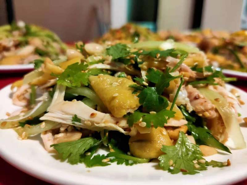6:撕好鸡肉,加辅料芝麻油、炒白芝麻、青瓜丝、辣椒油、香菜、柠檬等一起拌匀,一份可口美味的大学农夫骨香鸡——手撕鸡就做好了。