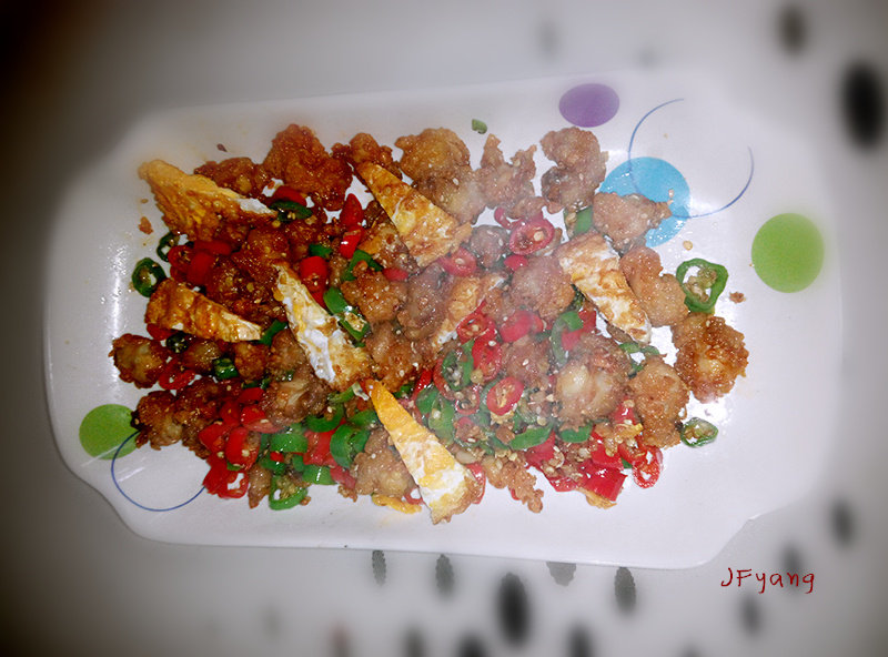 8:辣椒的香味炒出来之后关小火,下入煎蛋和鸡脆骨拌炒(火一定要小,不能炒太久不然鸡脆骨外边的裹粉会软掉)