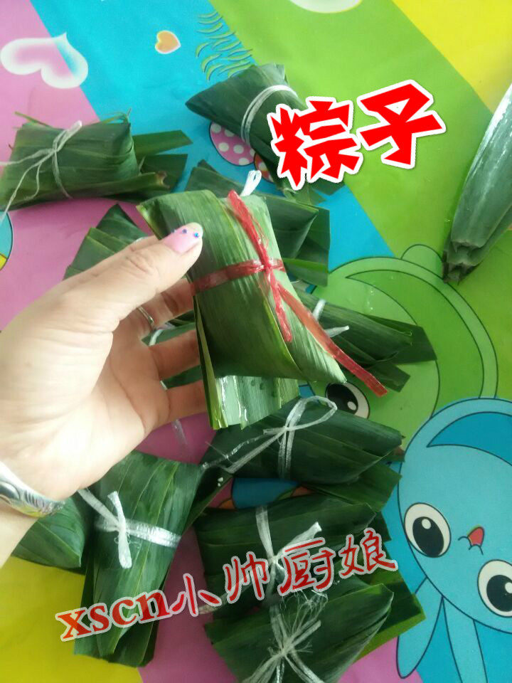 6:取捏壳撕去两边卷曲部分作粽绳用,用剪刀把破损的部分剪去。