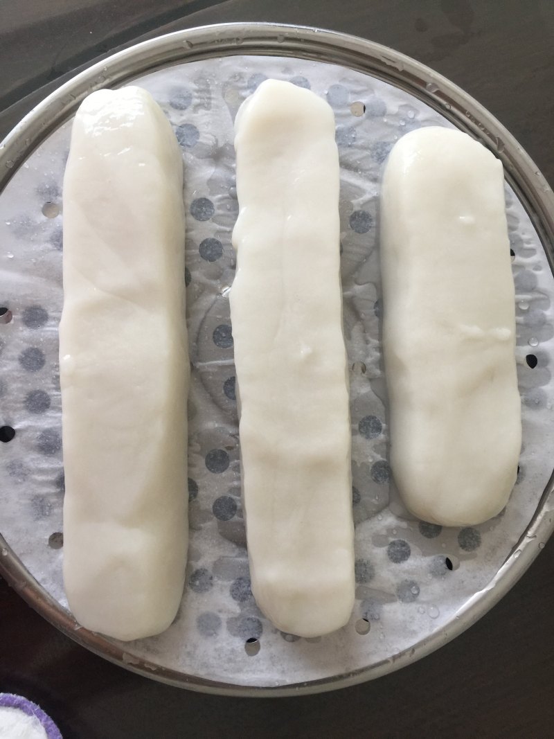 6:这时候的米粉结块的,用手搓碎,上锅蒸熟,趁热用擀面杖戳打(双手沾了米浆,不方便拍照)。