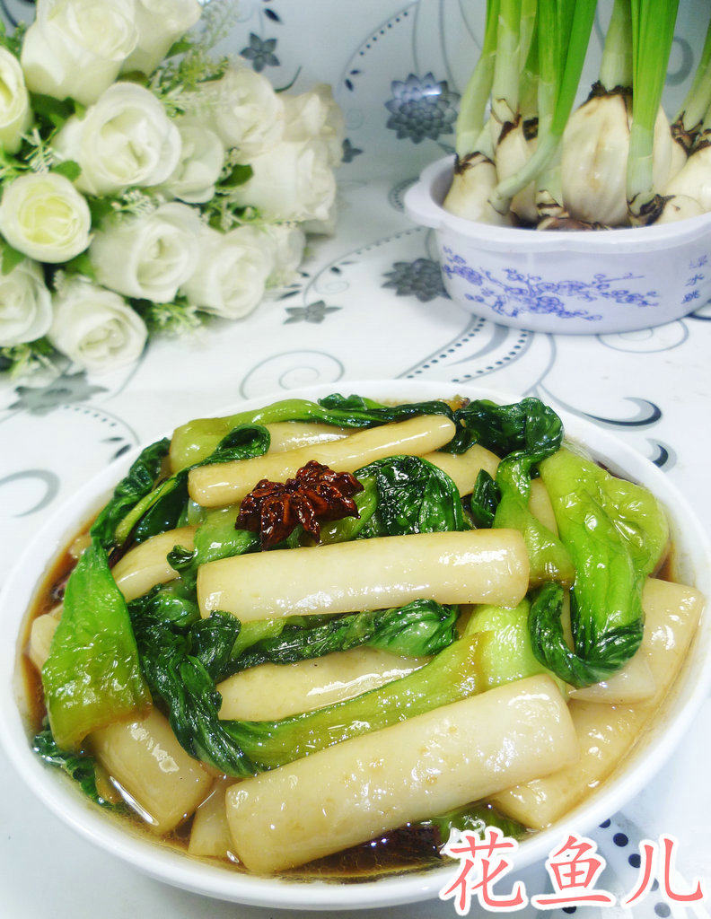 10:然后,合入年糕翻炒翻炒,用中小火慢慢的将青菜里水分逼出来。