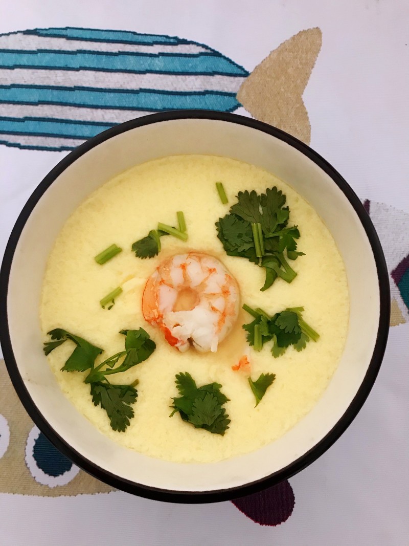 3:3:10分钟后将碗取出,虾放到鸡蛋羹上,撒上香菜!清淡鲜美的鸡蛋羹就做好了!