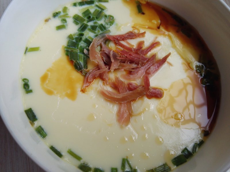 7:今天家里正好有盐鸡腿丝,洒一点鸡丝在上面,再淋一点生抽,哇咔咔,摇身一变,就成了鸡丝蛋羹了,就地取材,美味