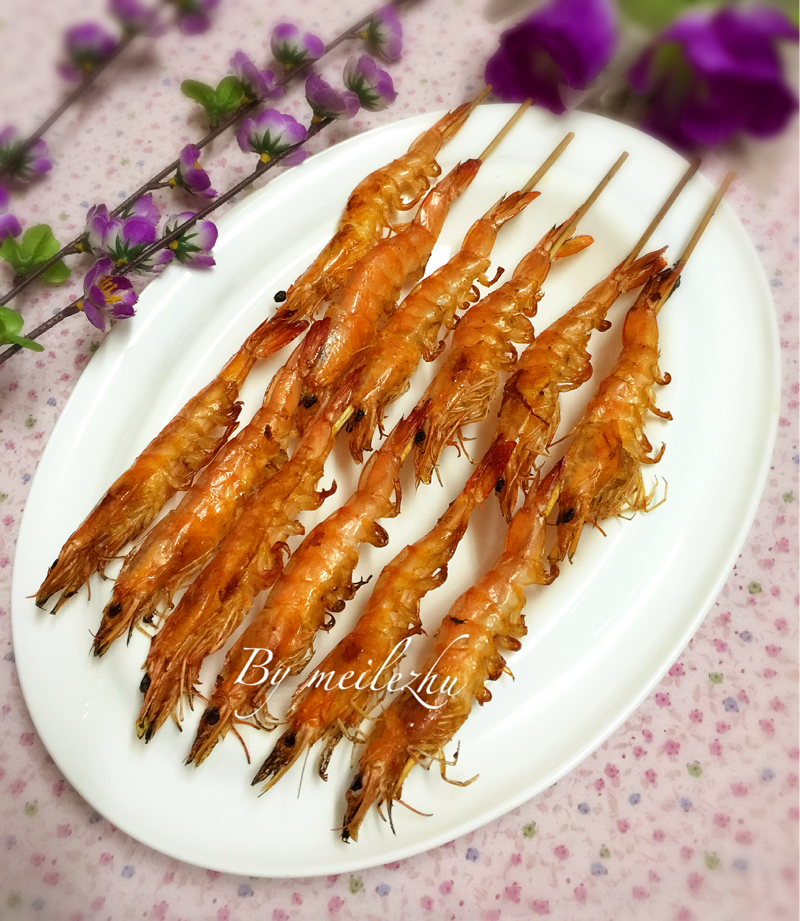 6:用消毒过的竹签把虾依次串起来,并刷上一层食用油。