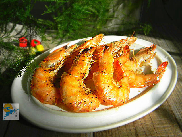 5:烤盘中垫上锡纸,把大虾排好队放好,再磨入点黑椒碎;