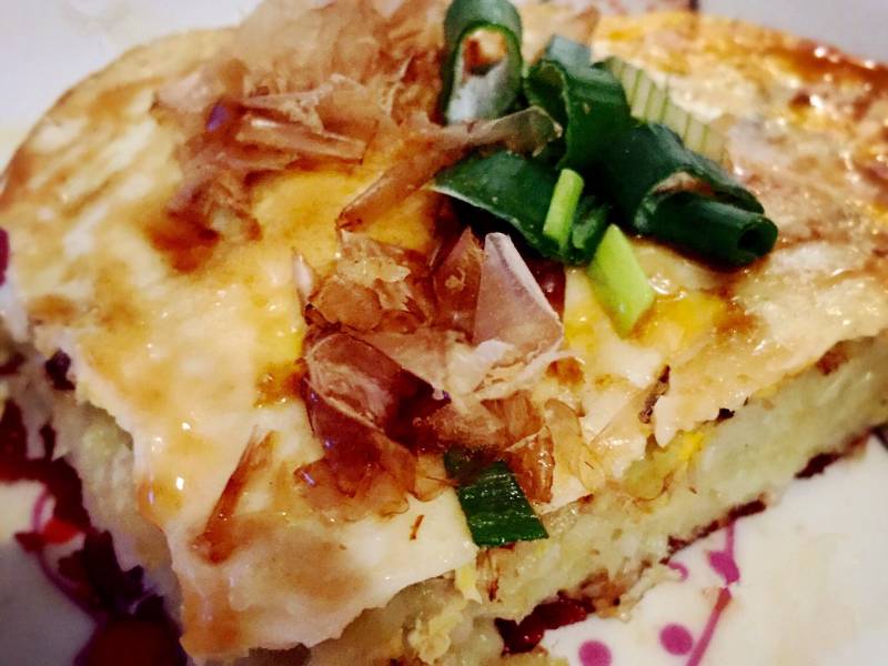 5:煎熟的饼盛出,鸡蛋一面朝上。刷上照烧汁。撒上木鱼花和葱花。完成!