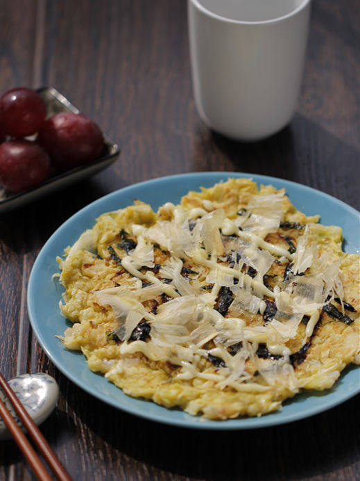 7:这个改良版本的大阪烧,火候控制得当的话,边缘还会有点焦脆,培根被煎得焦脆,隐约有焦糖的甜味;因为菜叶多,吃起来口感清甜;相比海苔粉,海苔丝能提供更丰富的层次感,而且随随便便摆盘都很漂亮