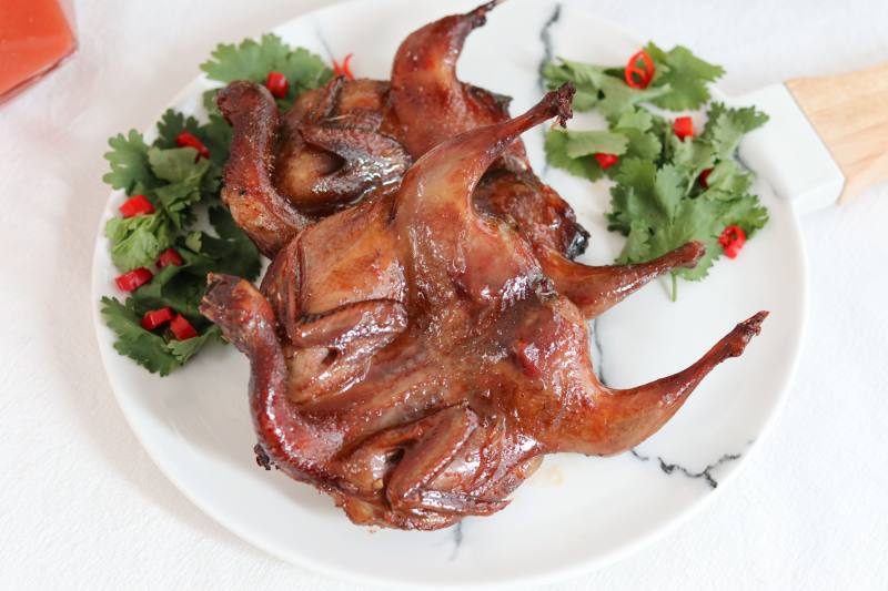 7:再次取出鹌鹑,两面刷上薄薄的蜂蜜水,然后表皮朝上,继续烘烤5-8分钟,上色均匀后即可出炉。