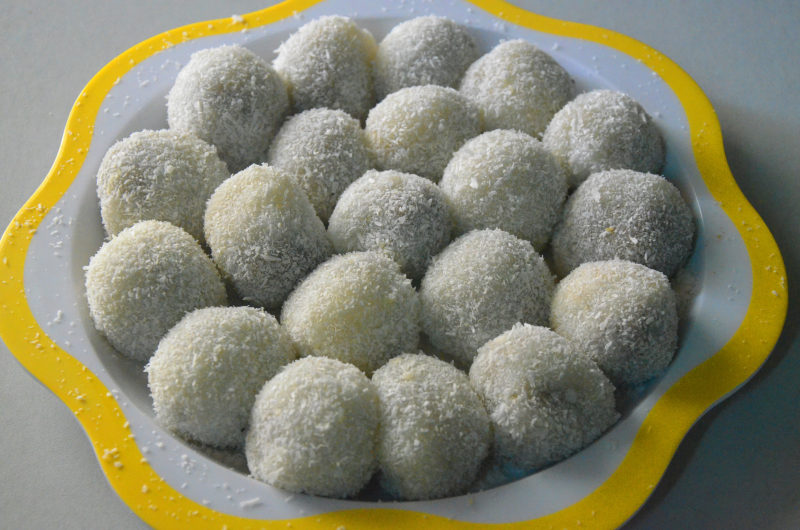 8:将包好的糯米糍充分裹上椰蓉即可。