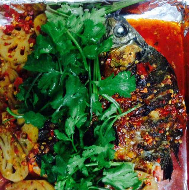 5:10分钟后,将锅里的泡海椒煮藕倒在烤鱼上,在继续烤10分钟。