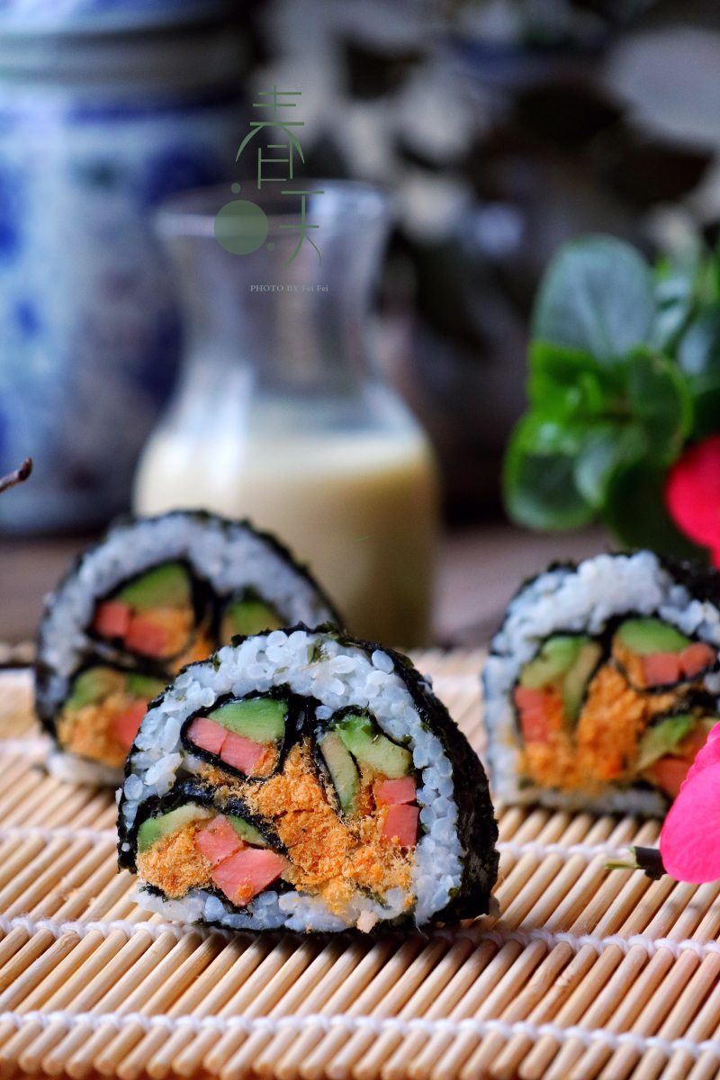 1、蔬菜可以放胡萝卜或者其他的自己喜欢吃的。2、可以放鱼子酱,金枪鱼等。3、寿司醋和米饭比例大概1:5,不喜欢酸口可以少放些寿司醋。