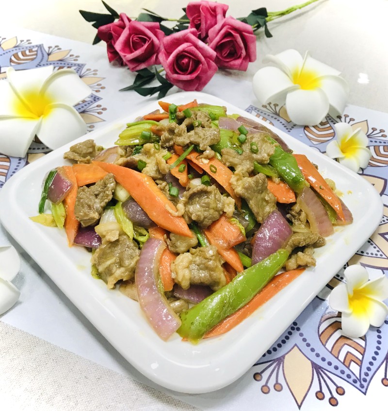 牛肉煎的时候要特别注意火候,五成熟即可,最后回锅翻炒到8分数出锅,不可煎老了
