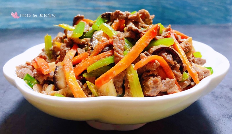 1:新鲜的牛肉在清水中浸泡半小时沥干水份牛肉切成肉丝。