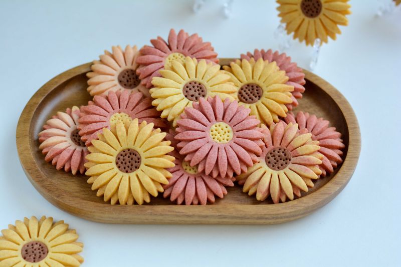 17:将花瓣材料里黄油软化加糖粉打发,分次加入蛋液拌匀,筛入低粉拌匀,加入少许红色色素,用椭圆形切模切出花瓣形状。烤箱180度15分钟左右