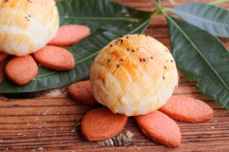 14:准备一片塑料片,在蛋黄酥表面切成菱格