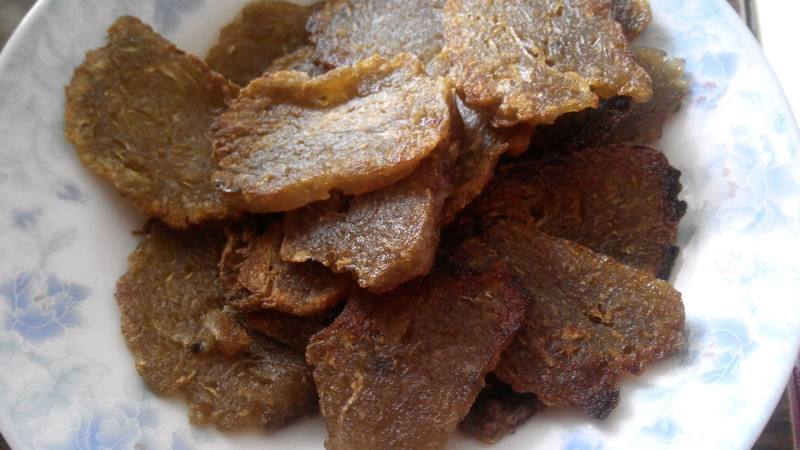 8:锅里倒入花生油或玉米油,烧至5.6成热,放入剁好的果肉,小火炸至金黄色,捞起沥干油,摆盘既可。
