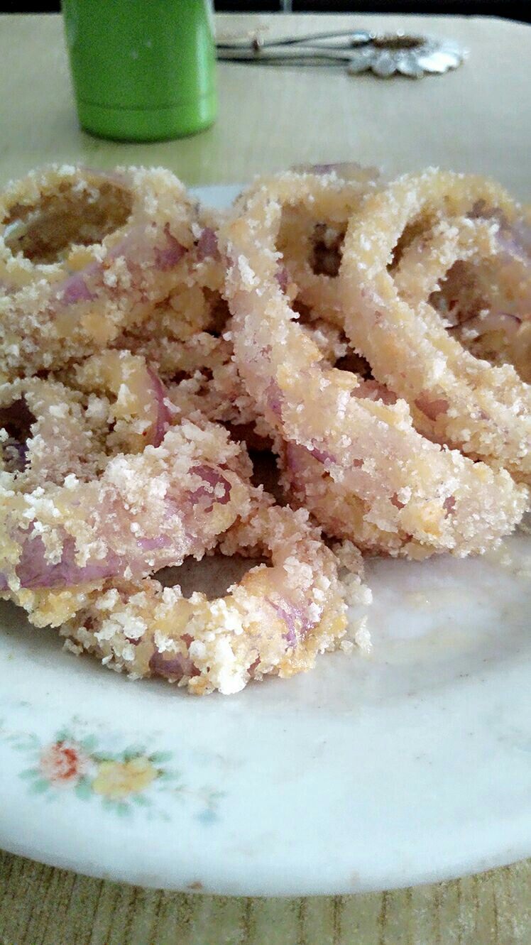 2:锅里放植物油加热,把洋葱圈放进蛋清里裹一下,再再马上裹一层面包糠,按上面做法把洋葱圈依次裹好蛋清和面包糠,待油温达到一定程度(手放上面能感觉到温度就行)把洋葱圈依次放进去两面炸一下就OK(半分钟到一分钟吧,不要炸久,炸久了洋葱就焉了,失去水分不脆了)