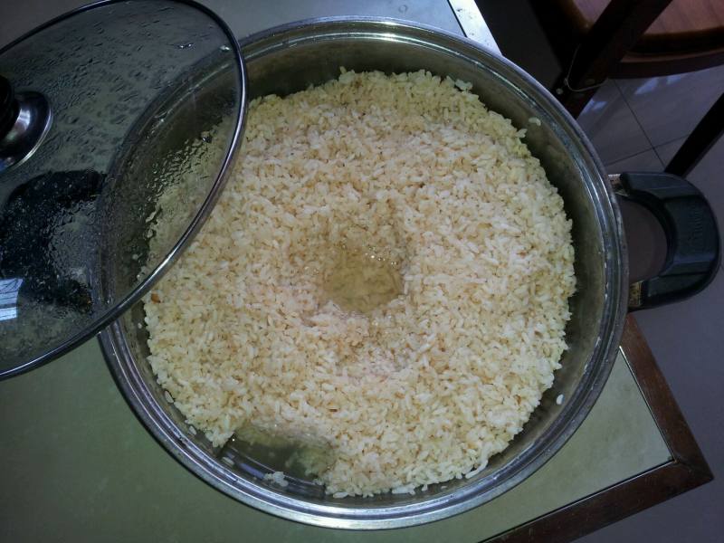 9:根据米饭的软硬度加入适量的凉开水,但不能加水后变成厚稀饭;