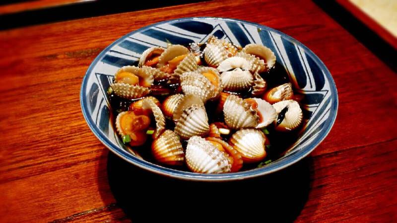 5:锅里加入150毫升开水煮沸放入所有调料搅匀关火,倒入碗里放凉后,再放入剥好的花蚶拌匀浸泡10分钟即可。
